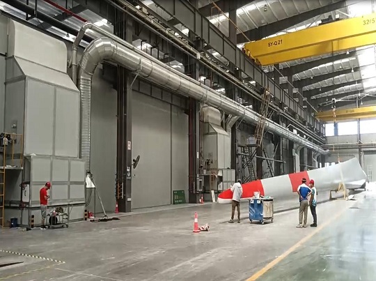 • 生產風電葉片,九通承接安裝輥涂噴烤漆房,主要包含恒溫房設備2套、輥烘噴烤漆房設備1套、活性炭吸附+催化燃燒設備1套,在雙方通力合作下按期保質地完成整線設計、安裝、調試以及培訓,完成度高,現已無故障輥涂1年多。